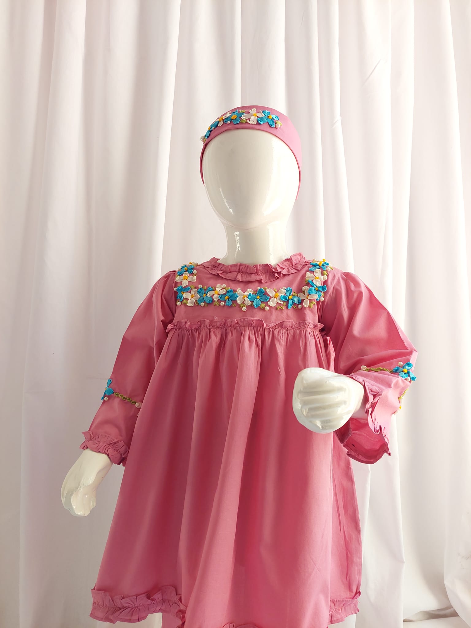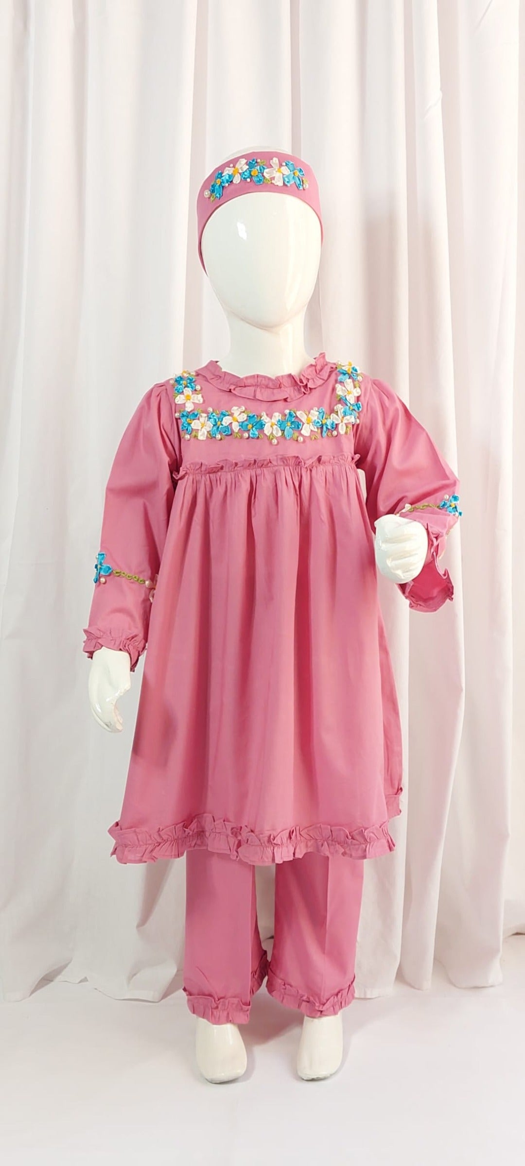 Hand Embroided Ribbon work done on this frock with frills. Frock and Trouser is available in this article.